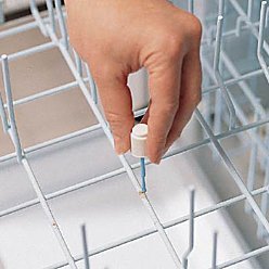 Quick fix for nicked dishwasher racks! Now you can "touch-up" those nicks and chips that inevitably occur in your dishwasher racks' plastic coating. (It'll help prevent the rust and corrosion that can leave dirty dishes.) Our special dab-on paint is highly-resistant to dishwasher detergents and high heat cycles, for a durable repair you only have to do once. 2-oz. bottle includes cap-and-brush applicator. When ordering Dishwasher Rack Repair, please specify color: white or blue. No express delivery.We also offer Dishwasher Rack Caps which you can buy separately, or SAVE . when you buy it with the Dishwasher Rack Repair below!